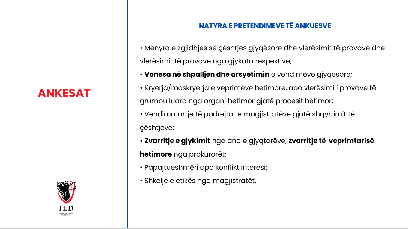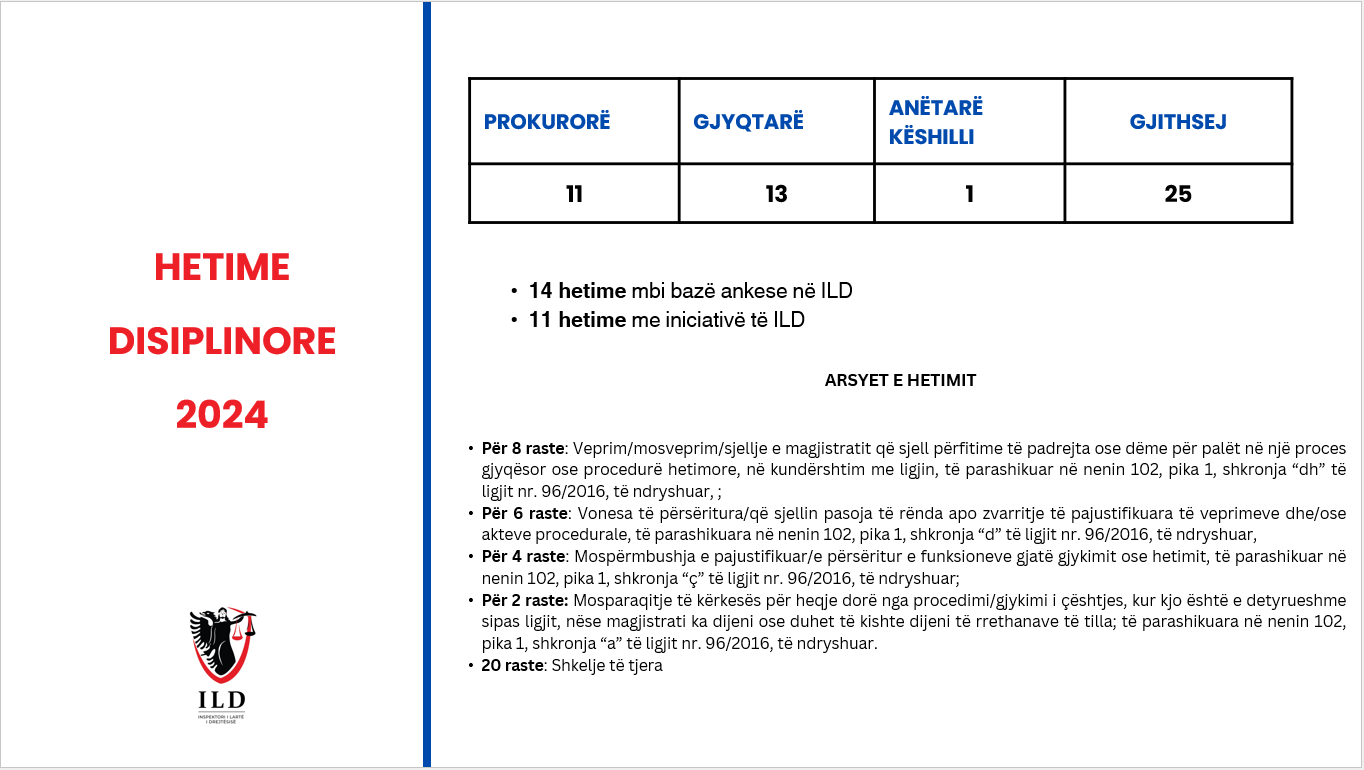 Zoti Metani bëri një paraqitje grafike të dinamikës së punës së ILD-së gjatë vitit 2024, duke u ndalur tek funksionet kryesore të institucionit, lidhur me administrimin e trajtimin e ankesave, hetimin e procedimin disiplinor dhe inspektimet. Më tej Inspektori i Lartë i Drejtësisë paraqiti ecurinë e veprimtarisë së ILD-së ndër vite, me të dhëna konkrete, që prej nisjes së funksionimit, në vitin 2020 dhe synimet për rritjen e efikasitetit të punës, në funksion të transparencës e forcimit të besimit të publikut tek ILD dhe institucionet e drejtësisë.